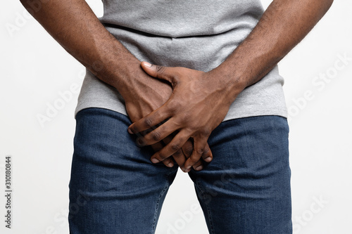 Cropped of black guy holding his groin