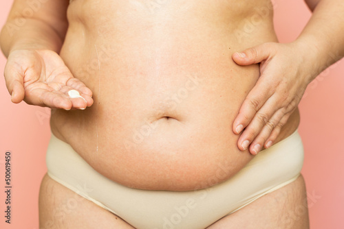 Cropped overweight woman in underwear applying and painting moisturizer cream lotion to her abdomen. Belly fat removal. Cellulite obesity. Wearing underwear, doing self massage to puffy skin.