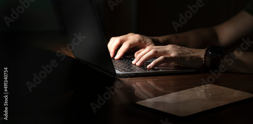 Cropped shot of businessman working on Laptop at desk. Dark tone with copy space.