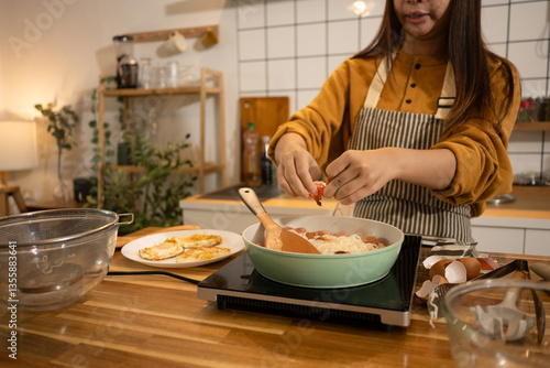 cooking, domestic life, housework, preparation, homemade, kitchen, food and drink, one person, ingredient, happiness, casual clothes, homemaker, healthy eating, lifestyle, food, woman, indoor, young adult, smiling, making, meal, lunch, enjoyment, joy, relaxation, tasting, comfortable, carefree, kitchen utensile, nourishment, simplicity, life, confident, satisfaction, hobby, home, dinner, receipe, asian, interior, counter, house, cookery, menu, nutrient, weekend, noodle, homeowner