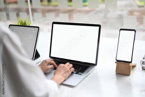 Cropped shot woman typing mockup laptop and empty screen of smartphone.