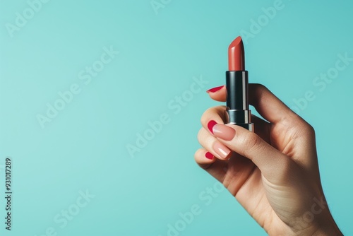Cropped view of a refined woman presenter holding lipstick, blending feminine grace and style, with a focus on her hand and the product against a solid color background