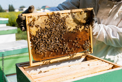 cropped view of apiarist in protective gloves holding honeycomb frame near beehive