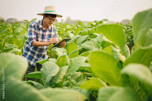 Cropped view of Asian farmer working in tobacco field checking quality of tobacco leaves, counting age before harvest and inspect the quality in the farm, Agriculture concept.