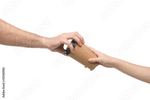 adult, man, caffeine, drink, hand, beverage, woman, partial, cropped, two people, isolated on white, copy space, studio shot
