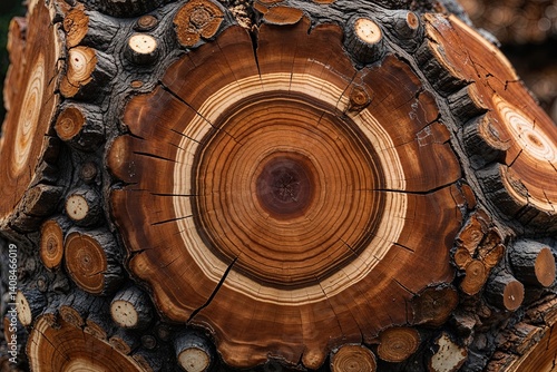 Cross Section Tree Stump Revealing Annual Growth Rings and Bark Features in Deep Brown Hues