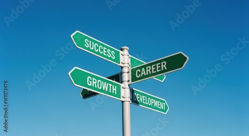 signpost, crossroad, direction, choice, decision, path, way, future, career, success, growth, development, ambition, aspiration, goal, objective, progress, advancement, opportunity, potential, journey, life, business, strategy, planning, guidance, inspiration, motivation, concept, idea, abstract, metaphor, symbol, clear sky, blue skies, bright, sunny, daytime, clean, simple, modern, graphic, visual, communication