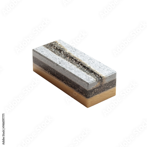 stone, granite, basalt, wood, layered, cross section, geology, earth science, texture, material, construction, building material, natural stone, rock, mineral, sample, specimen, grey, brown, black, composite, strata, layer, structure, pattern, background, design, abstract, science, education, illustration, detail, closeup, isolated, white background, industrial, raw material, earth, nature