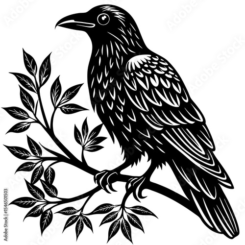 crow, bird, tree branch, raven, nature, wildlife, animal, tree, perch, leaf, isolated, white, background, black, silhouette, wild, forest, wildwood, foliage, flora, botanical, avian, feather, wing, beak, eye, illustration, drawing, design, art