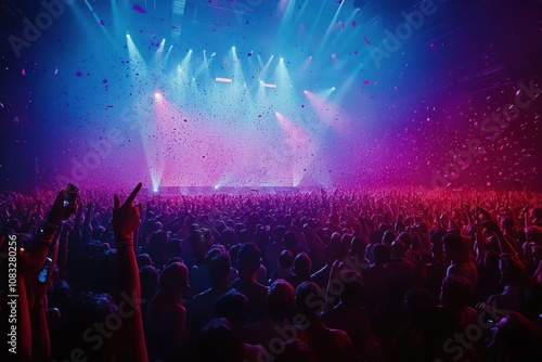Crowd in concert with confetti falling. This image is perfect for illustrating the excitement and energy of a live music event.
