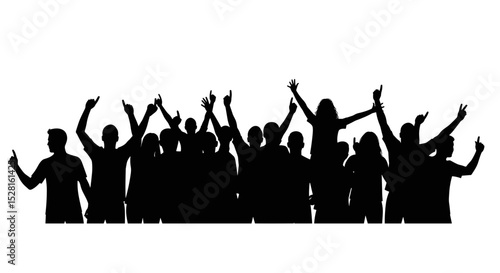 Crowd of silhouettes celebrating with raised hands against white background