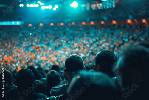 Crowd of spectators on grandstand of sports arena, rear view. Men are watching soccer or hockey.