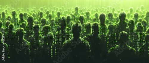 Crowd with Heads Composed of Glowing Green Binary Code. AI generated illustration