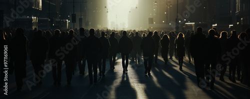 Crowds of people walking in a city street. Silhouette style. Men and woman. Corporate dystopian style. Back lit by the setting sun light rays casting shadow on the concrete street ground. Wide view.