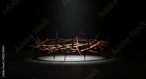 crown, thorn, jesus christ, christianity, religion, faith, suffering, sacrifice, holy, martyrdom, pain, dark, light, spotlight, dramatic, symbolic, image, religious, art, digital, rendering, three-dimensional, illustration, spirituality, bible, jesus christ, dark background