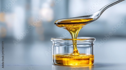 Crude oil sample poured from metal spoon in laboratory glass container, concept of petroleum research and analysis.