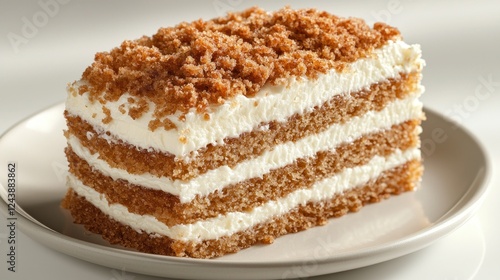 Crumb-topped cake slice on plate, studio shot
