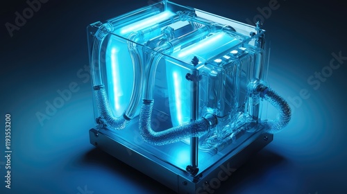 Cryogenic chamber for quantum processors emitting faint blue light with complex tubing and frosted glass