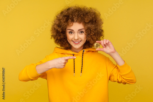 Cryptocurrency, digital money. Portrait of happy curly-haired woman in urban style hoodie showing golden bitcoin and smiling, pointing at btc coin. indoor studio shot isolated on yellow background