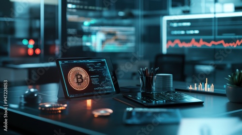 Cryptocurrency Trading Desk: A sleek and modern office with a tablet displaying a Bitcoin logo, surrounded by charts and data, captures the essence of digital finance.