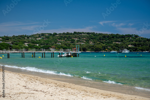 Crystal clear blue water of legendary Pampelonne beach near Saint-Tropez, summer vacation on white sandy beaches of French Riviera, France