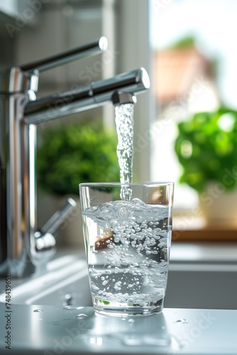 Crystal clear water flowing from kitchen tap into glass with copy space