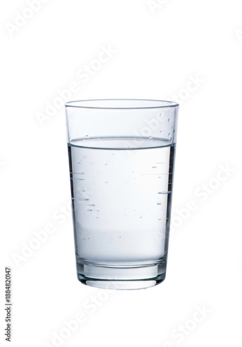 Crystal-clear glass tumbler, half-filled with pure sparkling water, cool reflections, condensation, isolated on white background with copy space, concept of refreshing hydration and purity