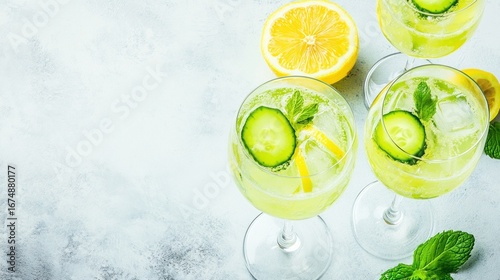 drink, lemonade, cucumber, lemon, mint, ice, glasses, beverage, refreshing, cool, summer, healthy, hydratation, thirst, citrous, green, yellow, light, background, table, topview, copy space, food photography, lifestyle, advertising, marketing, eatery, menu, receipe, blog, website, poster, banner, print, digital, commercial, editorial, image, visual, content, fresh, natural, organic, vibrant, bright, clean