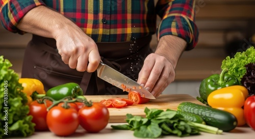 Culinary artistry: A chef meticulously slices fresh tomatoes on a wooden cutting board amidst an array of colorful vegetables, showcasing the artistry of culinary preparation.