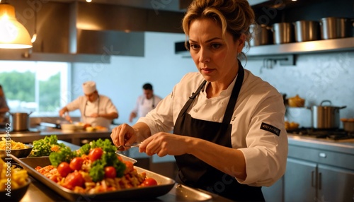 Culinary Artistry: A seasoned chef preparing a mouthwatering dish in her kitchen, her years of experience and passion for food shining through in every flavorful creation.