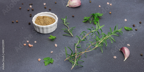 Culinary background with spices and fresh herbs. Garlic, rosemary, sea salt, black peppercorn