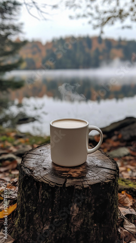 Cup of coffee on the lake background.
