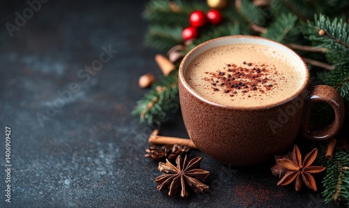 Cup of coffee with christmas decorations on dark background. Christmas and New Year concept