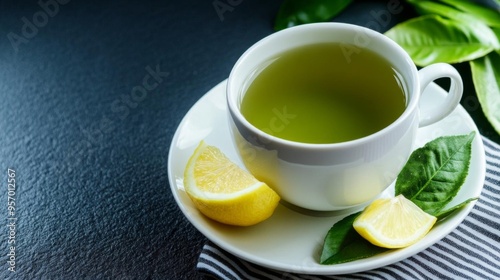 Cup of green tea with a lemon wedge on the side, rich in antioxidants, brainstimulating beverage