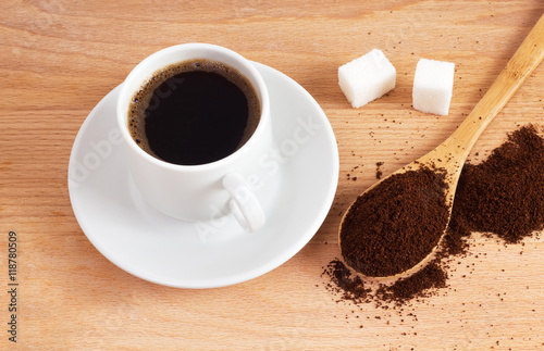 Cup of ground coffee in a spoon on the table