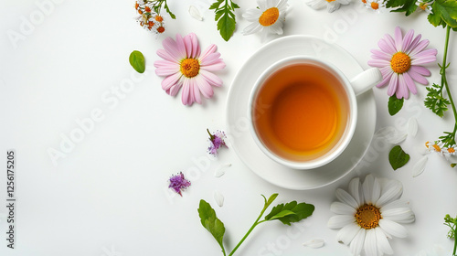 cup of tea and flowers on an isolated white background, object focused, png, stock image, hd quality,