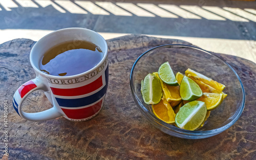 Cup with ginger tea and lemon orange lime citrus fruits.