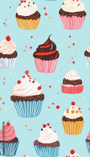 cupcake, dessert, sweet, pastry, bakery, cake, sprinkle, frosting, whipped cream, chocolate, vanilla, cherry, blue, pink, yellow, orange, white, red, cute, pattern, seamless, repeat, background, digital, design, illustration, graphic, vector, textile, fabric, wallpaper, wrapping, paper, decor, art, bright, colourful, happy, birthday, celebration, party, food, culinary, delicious, tasty