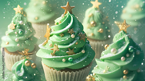 Cupcakes topped with swirls of green buttercream, styled as Christmas trees with bright decorations and a golden star, perfect for holiday cheer