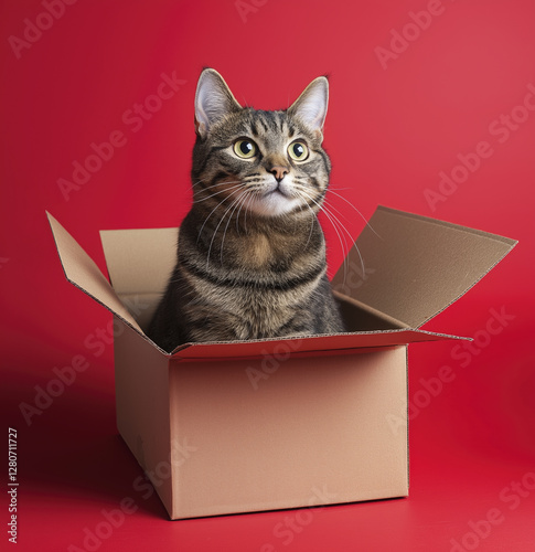 Curious cat sitting in cardboard box red background