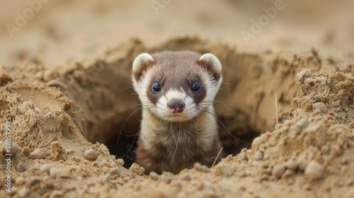 Curious european polecat peeks out of its sandy den, its dark eyes sparkling with interest in the wild