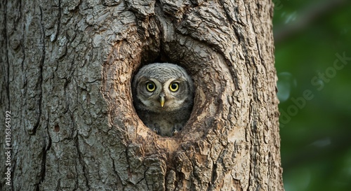 owl, tree, bird, hole, nest, wildlife, nature, animal, forest, wood, wild, outdoors, creature, avian, fauna, feather, beak, eye, head, face, look, stare, watching, observing, perched, cavity, hollow, trunk, bark, wood, grey, brown, plumage, nocturnal, predator, prey, hunting, flightless, young, juvenile, baby, small, cute, adorable, innocent, round, symmetric