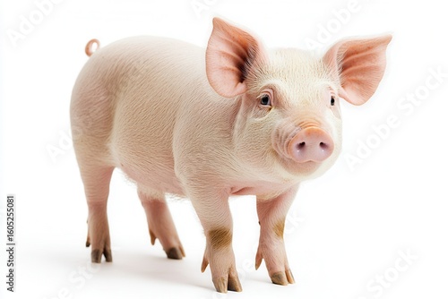 Curious pink pig stands on white background, exploring a new world with perked ears and a gentle gaze