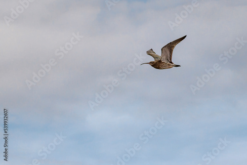curlew in flight with sky background