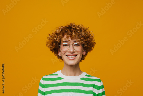 woman, adult, white, european, female, portrait, eyeglass, curly, studio, cheerful, laugh, coiffure, red, ginger, t-shirt, look, pose, yellow, disrobed, smile, model, day, isolated, indoor, 1, people