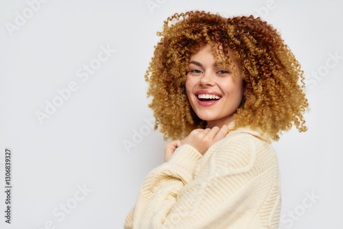 woman, smile, curly, hair, happy, portrait, sweater, background, beauty, joy, fashion, relaxed, vibrant, cheerful, cosy, expression, natural, personality, positive, light, style, youth, lifestyle, attractiveness, emotion, feeling, warmth, confidence, elegance, comfort, fun, friendly, model, happiness, bright, cute, grace, charme, look, innocence, shine, joyful, trendy, individuality, radiant, freshness, captivating, allure