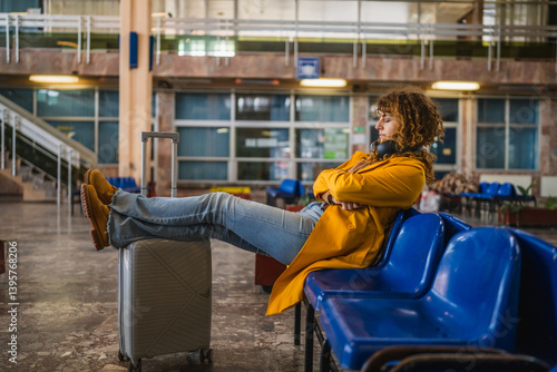 woman, impatient, depressed, bored, train, transportation, station, trip, suitcase, sleepy, exhaustion, baggage, wait, people, travel, holiday, vacation, communication, bonding, journey, indoor, togetherness, departure, 1, female, caucasian, copy space, late, waiting, sitting, young, adult, sleepy, boring, 1, time, curly hair, to sit, sleeping, falling, fall