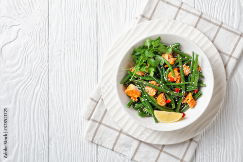 green beans, yellow, parsley, wedge, red pepper, sweet pepper, table, background, lemon, curry, white, light, empty space, meal, dinner, lunch, healthy, low-calorie, text, wood, bowl, plate, fillet, seafood, closeup, topview, cutlery, served, sesame seeds, garlic, free space, copy space