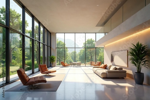 Curved glass, open-plan interior, natural light , simple, spacious