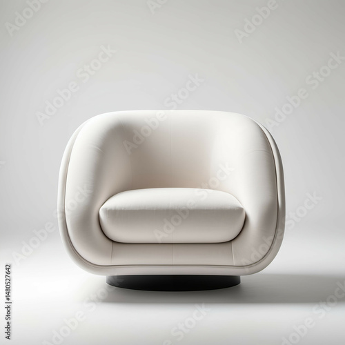 Curved minimalist armchair with soft edges, single-tone upholstery, plain white background
